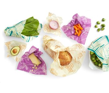 Bee's Wrap© is made with organic cotton, sustainably harvested beeswax, organic jojoba oil and tree resin. All wraps are fully biodegradable and compostable. The natural antibacterial properties of beeswax and jojoba oil help keep food fresh, and allow Bee's Wrap to be used again and again. It's easy. Simply wash with cool water and soap, hang to dry and repeat. Used several times each week, Bee's Wrap should last for roughly one year.