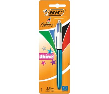 The Bic 4-Colour Pen features four smooth sliders at the top of the barrel for easy selection between black, blue, red and green ink. The chunky blue barrel provides a firm grip for comfort and control. This medium format pen features a 1mm tip for a line width of 0.4mm, ideal for general handwriting use.