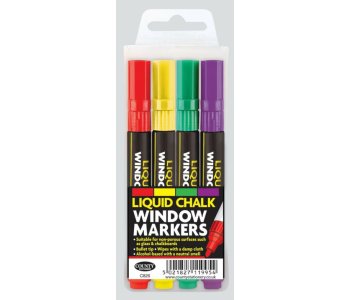 Pack of 4 Liquid Chalk Window Markers Assorted ColoursSuitable for Glass and ChalkboardsAlcohol Based with a Neutral Smell