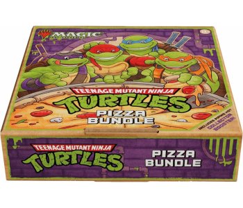 GET A BIG SLICE OF MAGIC WITH EVERYTHING ON IT- Calling all TMNT and Magic fans: any way you slice it, this hot and fresh bundle really delivers! Open the lid and you'll be greeted with nine Turtle-tastic Play Booster packs, 25 basic lands, and more