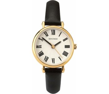This striking black leather strap watch, featuring a lustrous gold case and a chic cream dial. The contrast between the sleek black leather and the radiant gold case creates a captivating aesthetic that exudes sophistication and style. The creamy dial adds a touch of elegance, providing a subtle yet luxurious backdrop for the watch's timekeeping functions.